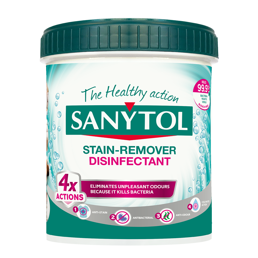 Sanytol, an expert in bleach-free disinfection, has developed a 4X ACTIONS stain remover that effectively eliminates germs, unpleasant odors, and tough stains, even at 20°C, while preserving colors wash after wash. Its enzyme-enriched formula penetrates deep into the fabric fibers, releasing stain-removing agents for impeccable results. Its unique, dermatologically tested formula eliminates odors more effectively than conventional detergent, providing up to 12 hours of freshness in damp clothes left in the drum.