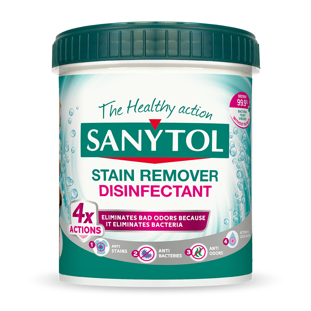 Sanytol, an expert in bleach-free disinfection, has developed a 4X ACTIONS stain remover that effectively eliminates germs, unpleasant odors, and tough stains, even at 20°C, while preserving colors wash after wash. Its enzyme-enriched formula penetrates deep into the fabric fibers, releasing stain-removing agents for impeccable results. Its unique, dermatologically tested formula eliminates odors more effectively than conventional detergent, providing up to 12 hours of freshness in damp clothes left in the drum.