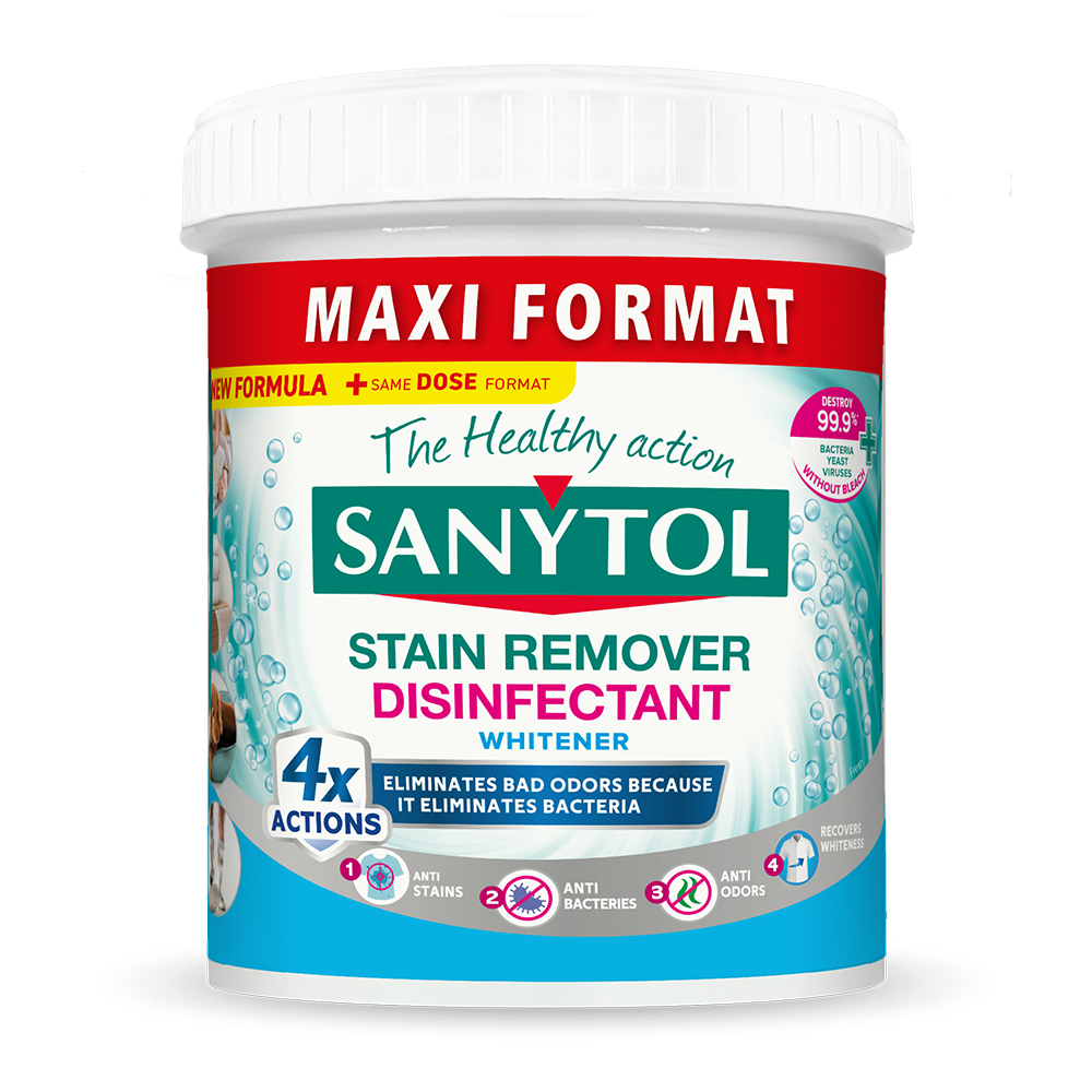 Sanytol, an expert in bleach-free disinfection, has developed a stain remover with 4X ACTIONS that effectively eliminates germs, unpleasant odors, and tough stains even at 20°C and revitalizes white clothes, even after 50 washes. Its unique, dermatologically tested formula eliminates odors more effectively than conventional detergent, providing up to 12 hours of freshness in damp clothes left in the drum.