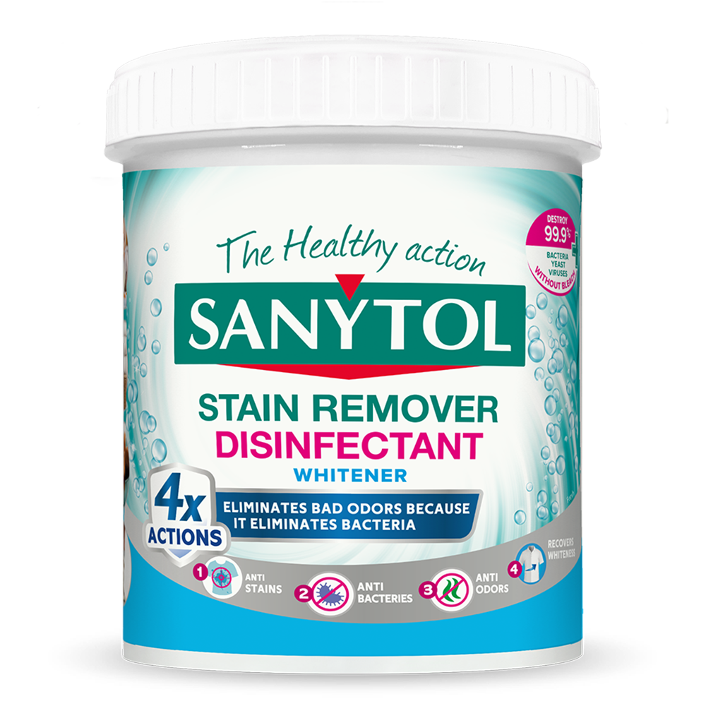 Sanytol, an expert in bleach-free disinfection, has developed a stain remover with 4X ACTIONS that effectively eliminates germs, unpleasant odors, and tough stains even at 20°C and revitalizes white clothes, even after 50 washes. Its unique, dermatologically tested formula eliminates odors more effectively than conventional detergent, providing up to 12 hours of freshness in damp clothes left in the drum.
